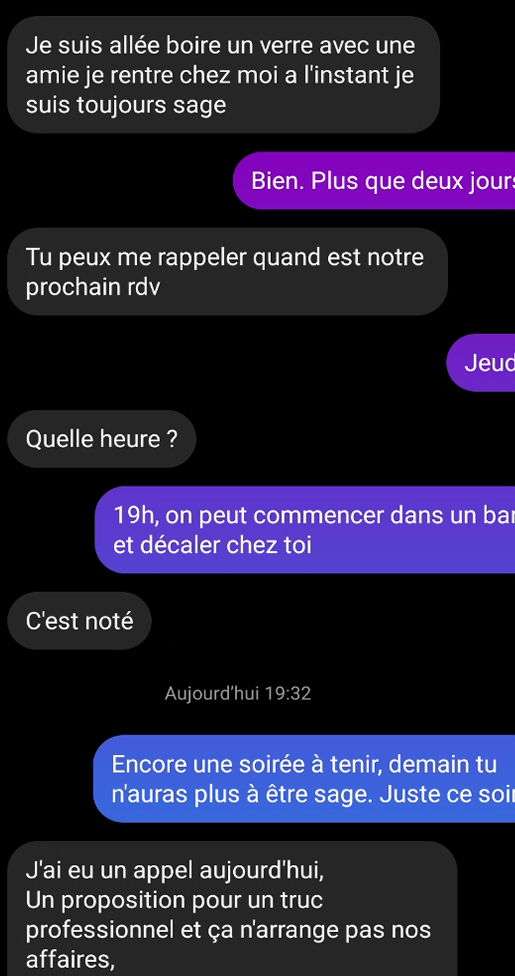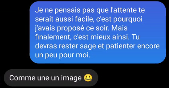Jusque là tout va bien...sauf que c'était censé être jeudi qui vient notre prochain rendez-vous, sauf qu'elle ne peut pas finalement, et j'ai un peu fait de la merde par message, avec la tension sexuelle, l'attente, ça a joué contre moi.