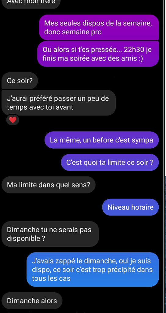 En gros j'ai trop précipité en lui disant qu'on pourrait se voir ce soir à la place, parce que dans ma tête je ne pouvais plus avant semaine pro. Grosse erreur selon moi. J'ai fait le mec pressé, qui était dans la demande, en chien alors que c'était censé être le contraire.