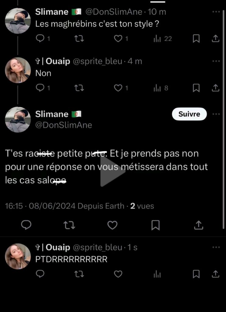 Le pire c'est qu'elle risque gros rien qu'avec sa réponse qui ne concerne que ses goût en matière d'homme voir même du pénal pour racisme ( on connais les gauchistes ) alors que lui rien du tout pour ses menaces et insultes a notre communauté. Merci l'Afrance