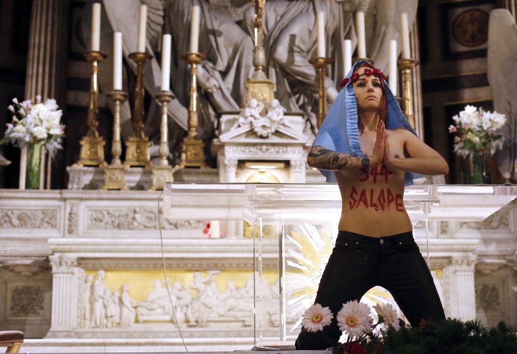 Eloïse Bouton, Femen, pénètre seins nus dans l’église de Madeleine remplis de fidèles (Paris), poitrine à l’air avec inscrit « 343 salopes », puis se met sur l’autel où elle simule l’avortement de Jesus avec des morceaux de foie de veau sanguinolents, et fini en pissant sur les marches de l’autel