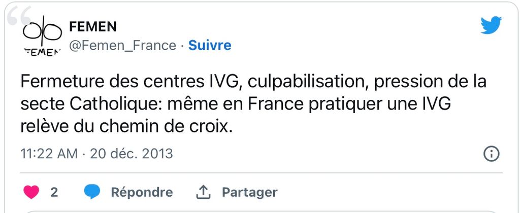 « Noël est annulé! Du Vatican à Paris. Le relais international de Femen contre les campagnes anti-avortement menées par le lobby catholique continue, la sainte mère Éloïse vient d’avorter de l’embryon de Jésus sur l’autel de la Madeleine »