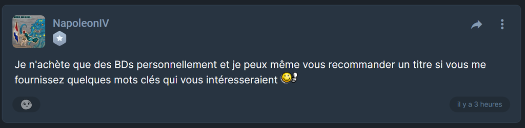 Et chaque fois que je foule les rayons de BD, ça me crève les yeux de voir les couvertures ignobles des BD mises en avant alors qu'en face, même le manga le moins beau reste plus attrayant que toutes ces saloperies éditées par des boomers qui n'ont aucune idée des attentes du public (et ils s'en tapent).