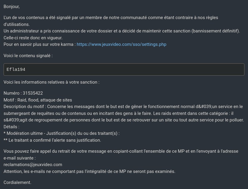 Bah oui ils mettent le pseudo en motif, j'imagine que comme ça il n'y a pas de preuve que c'est un message random qui s'est fait bannir, ça pourrait leur causer quelques soucis judiciaires à terme une censure pareille, on n'avait jamais vu ça, de vrais démons