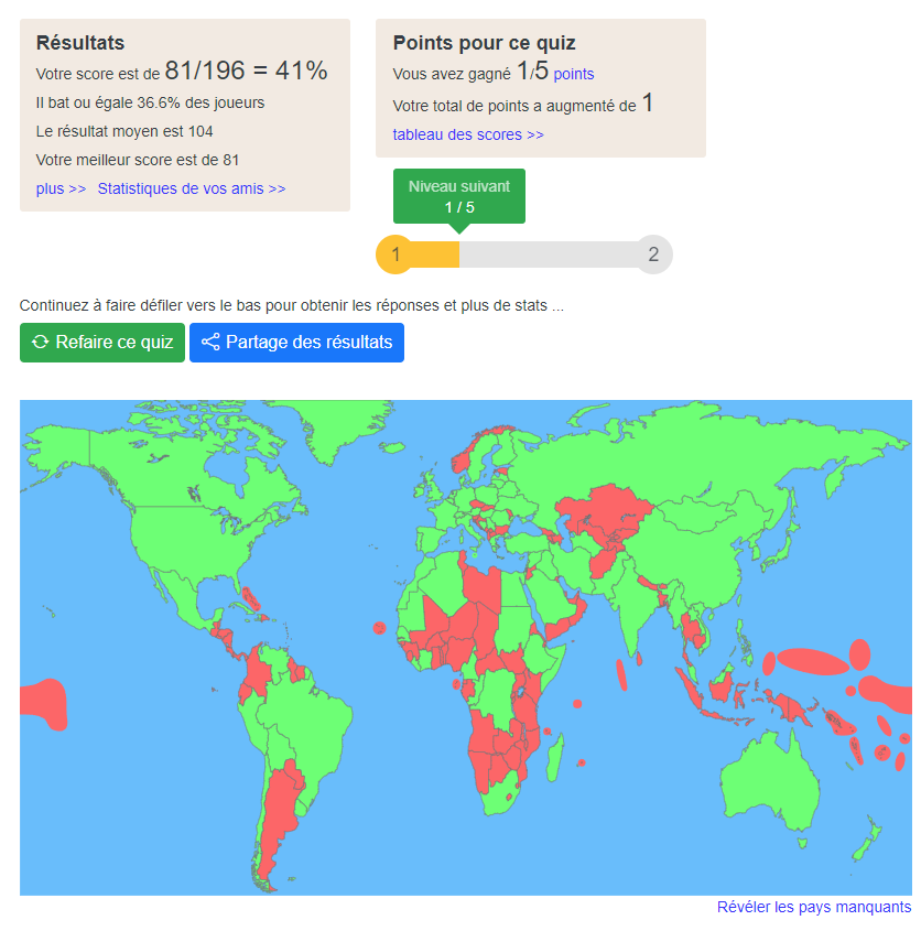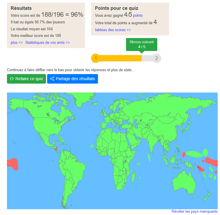 j'ai eu 122/196 mais j'aurais fait mieux avec plus de temps, là j'ai raté des trucs faciles comme estonie, vatican, lettonie, monaco, jamaique, guatemala, paraguay, taiwan