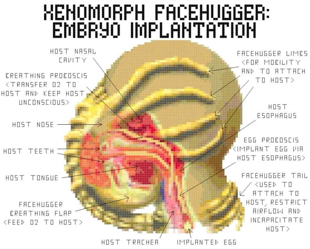 Oui mais l'alien n'insémine pas il saute sur ton visage en enroulant sa queue autour de ton cou, et à partir de là avec son tube il pond par ta gorge les oeufs qui écloront plus tard