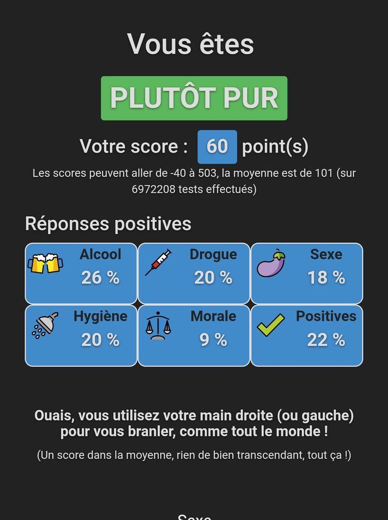 18% sexe en étant 0tout j'en conclue que tu t'es branlé en public et que tu regarde du hentai tentacule tous les jours