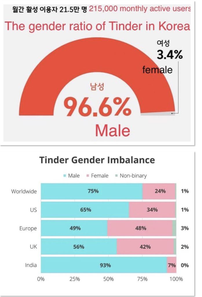 Et les femmes traditionnelles vont pas aller sur les applications de rencontres c'est un échantillon restreint celles sur les applis après je ne pense pas que ce soit si rare non plus d'utiliser une application de rencontre mais plein de meufs sont pas dans ce délire... En Corée du Sud apparements y'a environ 97% d'hommes sur Tinder