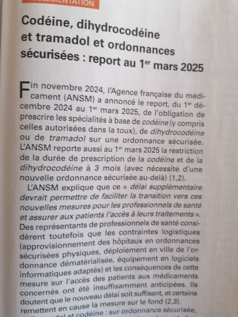 Chouette c'est reporté à Mars la mise sur ordo sécurisée de Codéine et Tramadol mes remplacements de début d'année seront moins chiants YOUPI !