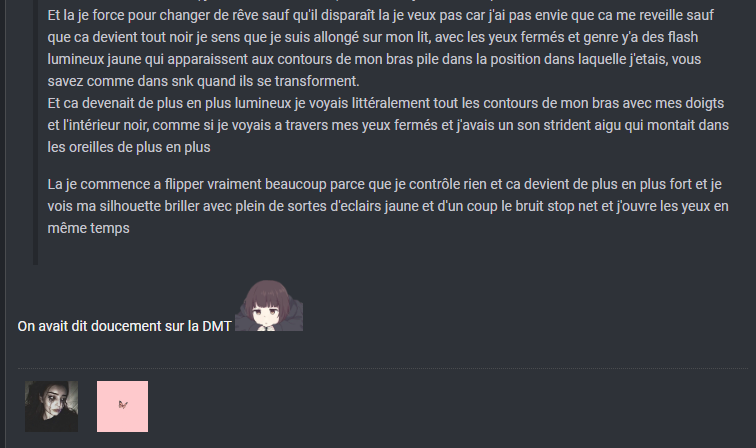 la derniere fois que j'en ai fait un je m'etais reveille et j'avais les yeux fermes et je voyais mon corps a travers brillant avec des sortes de filaments d'energie jaune