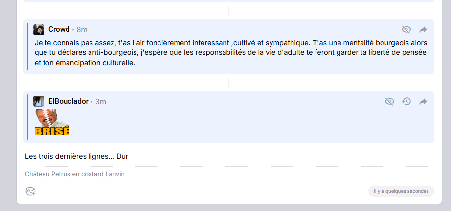Tu invente totalement un personnage sur moi a partir de certaines choses t'imagine le temps et l'énergie si je dois me justifier sur tout ? Ça va faire chier tout le monde et moi le premier, tout ca parce qu'on n'a rien à foutre au taf ce matin