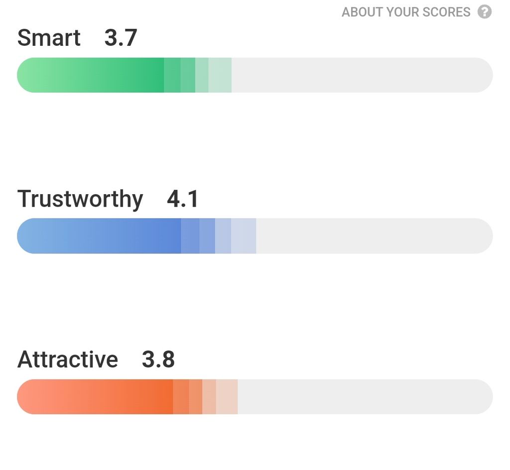 Bah je n'ai pas plu au Jury de Photofeeler, six votes pour dire "pas attirant" dont une qui a décidé d'être "gentille" en mettant que j'avais l'air digne de confiance et très intelligent