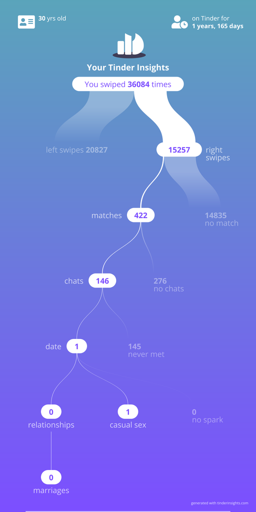 Je suis conscient que ça calcule un taux de 0.00655436848% de chance de baiser un profil que j'ai liké et 0.23% de chance de baiser un profil avec qui j'ai matché