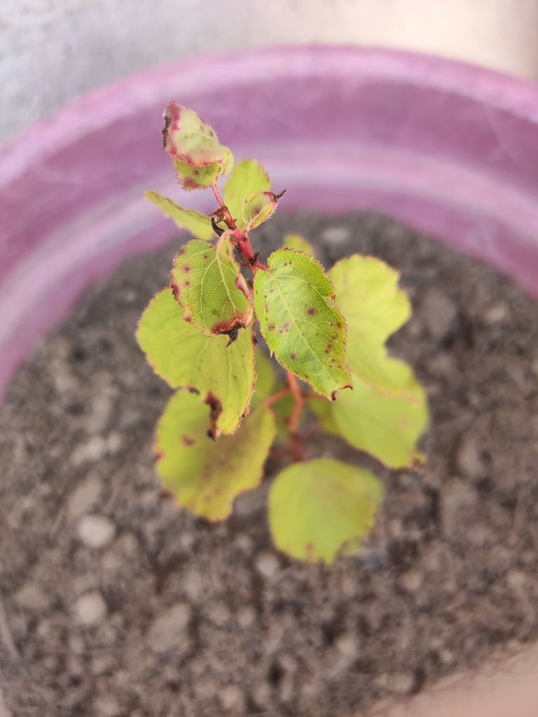 Depuis quelques semaines mon jeune abricotier ( 40-60 jours) que j'ai rempoté dans un pot plus grand a des point rouges ( Sa ne ressemble pas a des cloques, les points rouge sont dans la feuille).