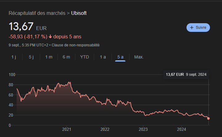 Les actions d'Ubisoft en baissé de 81% en 5 ans seulement.