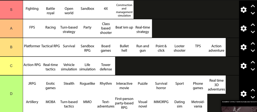 Tierlist des genres de jeux préférés