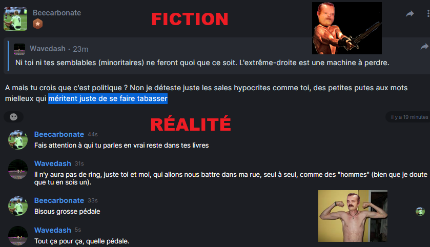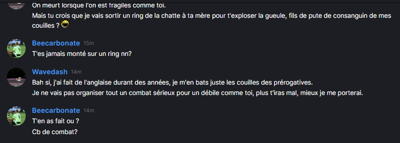 "ta fé de la box ou ta combatu combien de foi" comme si c'était le sujet. Ah et je peux montrer toute la discussion, il en ressortira qu'en définitive, t'as fui comme un lâche.