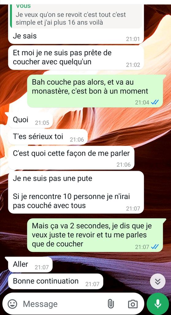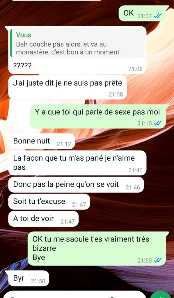 "Bon tu baise ou pas sale pute ? Je veux te sucer les orteils"