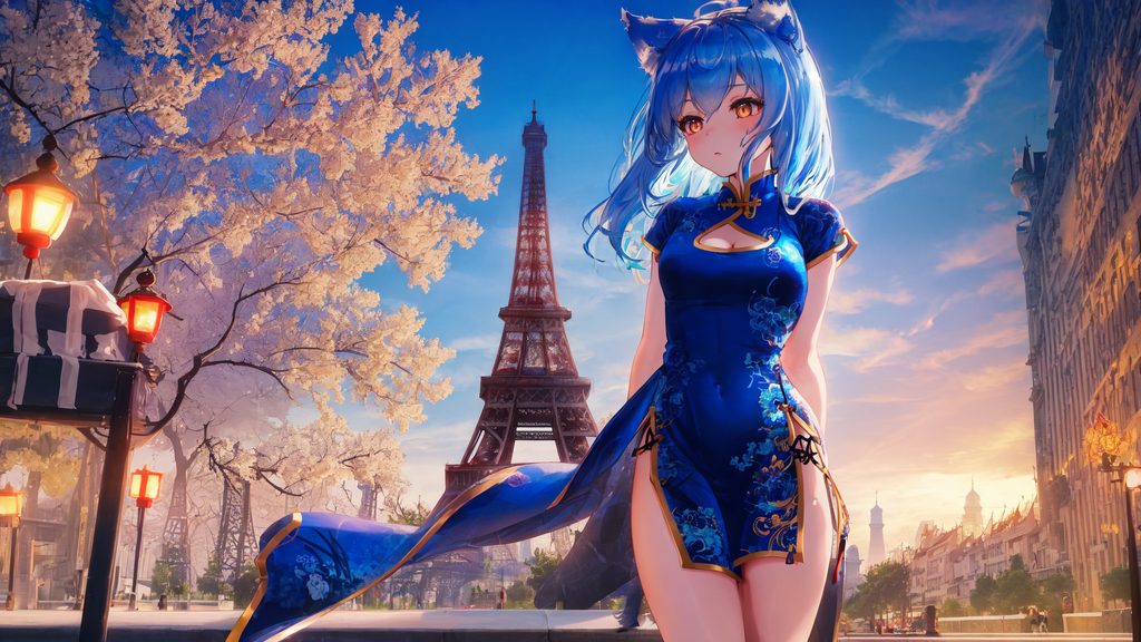 Une wolf girl aux cheveux bleus et en robe chinoise à Paris stp