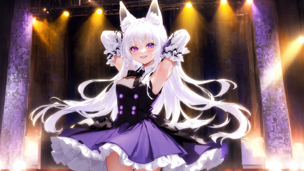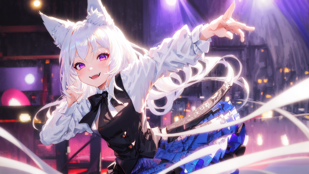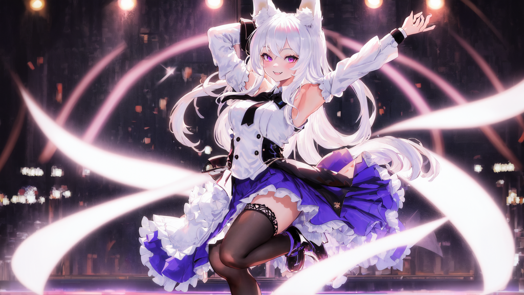 Girl, Fox ears, white hair, medium length hair, expressive, dancing, purple eyes, blue skirt, white shirt, black tie, smile, fangs, dance floor, looking at camera, black socks