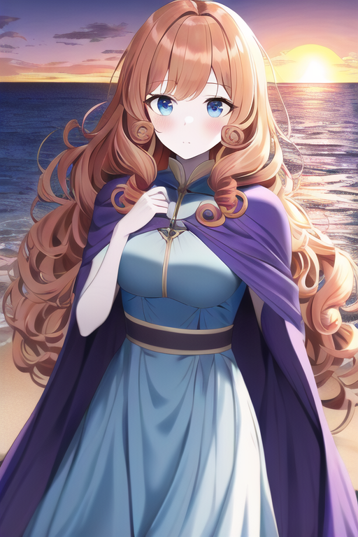 Je voudrais bien une femme rousse, les cheveux roux, longs et ondulés, la peau clair avec des yeux bleu azur, avec une cape violette et une tenue un peu bleu, avec un soleil qui se couche derrière sur la falaise, au bord de la mer où elle se trouve