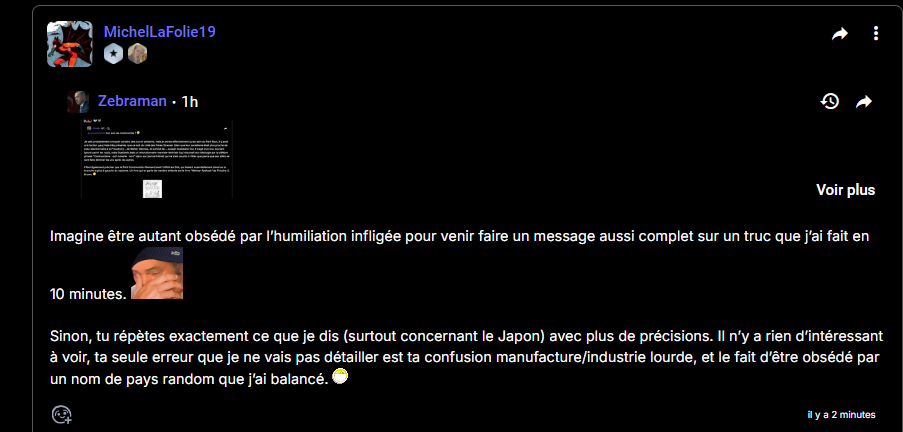 Imaginez, avoir pris de longues minutes à lire et me répondre de la merde, comme d'hab.
