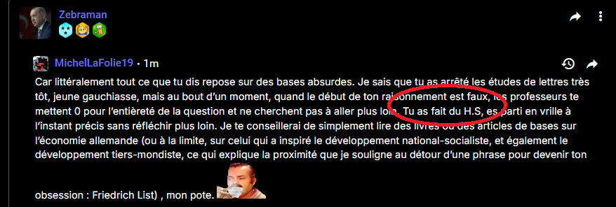 Car littéralement tout ce que tu dis repose sur des bases absurdes. Je sais que tu as arrêté les études de lettres très tôt, jeune gauchiasse, mais au bout d’un moment, quand le début de ton raisonnement est faux, les professeurs te mettent 0 pour l’entièreté de la question et ne cherchent pas à aller plus loin. Tu as fait du H.S en insistant sur le Vénézuéla (un sujet dont je m’en bats les rouflaquettes), es parti en vrille à l’instant précis sans réfléchir plus loin. Je te conseillerai de simplement lire des livres ou des articles de bases sur l’économie allemande (ou à la limite, sur celui qui a inspiré le développement national-socialiste, et également le développement tiers-mondiste, ce qui explique la proximité que je souligne au détour d’une phrase pour devenir ton obsession : Friedrich List) , mon pote.