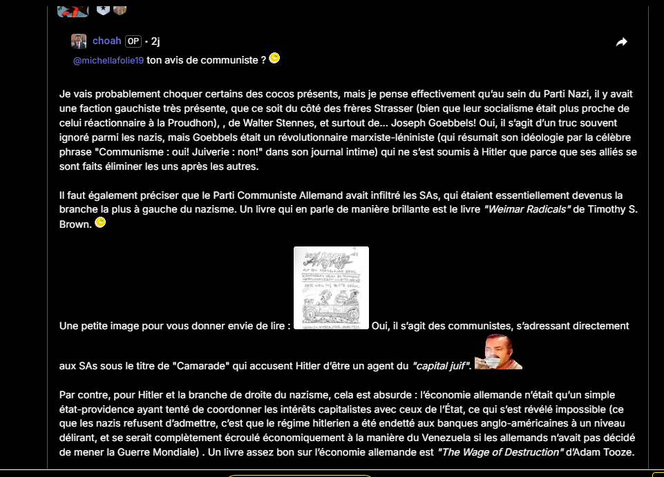 Donc si on va dans ta logique du socialiste coco centré, tu penses que l'application nazie est celle de l'endettement juif à ses débuts, tu ne prends pas en compte que l'endettement de l'Allemagne provient aussi de mesures économiques avant la montée hitlérienne.