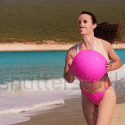 Une fille sur une plage en maillot de bain rose qui court en direction d'un ballon de plage bleu.