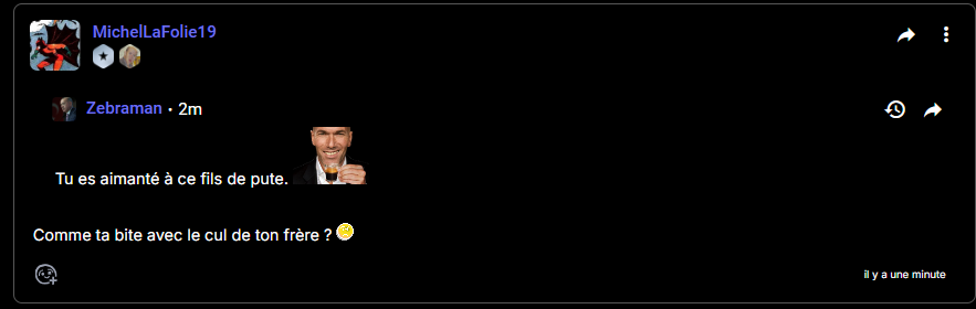Oui, on avait compris, fils de pute et je te dis, pourquoi tu viens parler de Leoben comme si c'était mon cas, je n'ai jamais dit que tu avais des secondaires, j'ai dit que l'autre pute de Choah, tu le suis comme un toutou, toi, comprendre, petit macaque ?