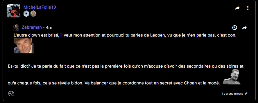 L'autre clown est brisé, il veut mon attention et pourquoi tu parles de Leoben, vu que je n'en parle pas, c'est con.