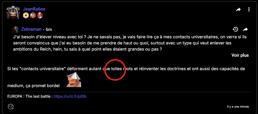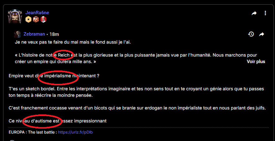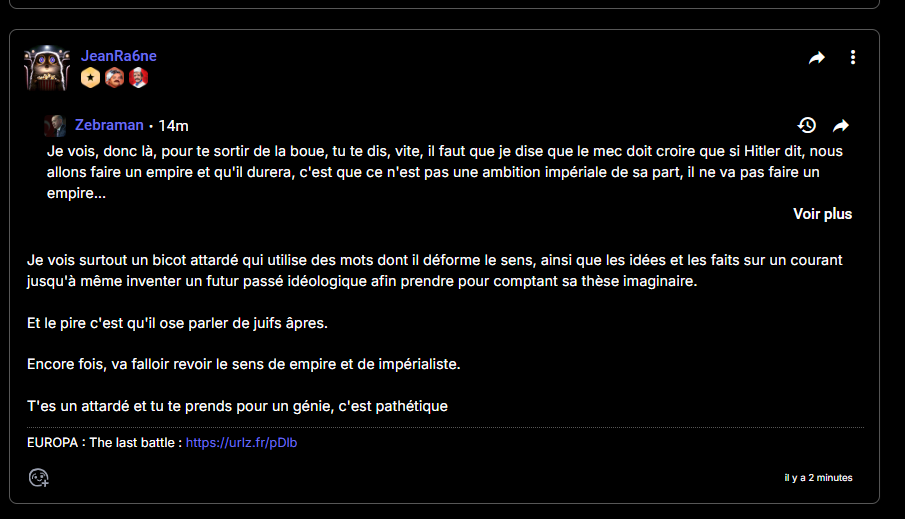 Dommage, quel dommage, on partait sur les nazis = mélenchonistes, on finit avec le mec déter en mode j'ai vu les vidéos Europa donc j'en déduis qu'Hitler et les nazis, ils n'avaient pas d'idée impérialiste, mais non, pas du tout, pour contrer des fils de pute de rouge et la juiverie, il ne faut pas l'impérialisme, c'est évident. Vous m'apprenez tellement de choses.
