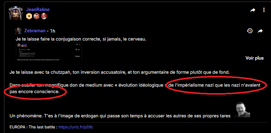 Lui, là, le petit JeanRa6ne, m'ouais, je n'aime pas les Jean, il y en a qui sont connus comme soi-disant faisant partie de la résistance dans le récit qu'on vous sert en France et c'étaient des merdes qui vous amènent à la république.