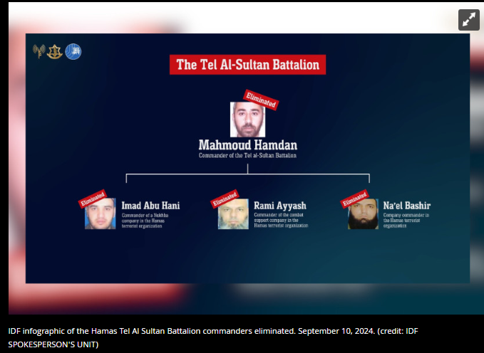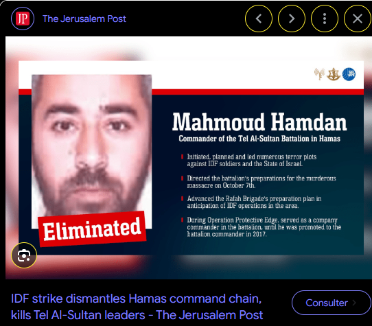 FDI : Le terroriste Mahmoud Hamdan (Tom), commandant du bataillon Tel al-Sultan du Hamas, était chargé de garder Yahya Sinwar et de superviser les six otages assassinés dans la région. Il y a quelques semaines, il a été évalué sur la base d'informations de renseignement, avec une forte probabilité qu'il ait été éliminé.
