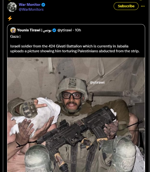 Un soldat israélien du 424e bataillon Givati, actuellement à Jabalia, met en ligne une photo le montrant en train de torturer des Palestiniens enlevés dans la bande.