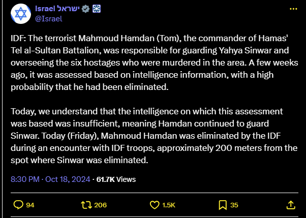 Aujourd’hui, nous comprenons que les renseignements sur lesquels reposait cette évaluation étaient insuffisants, ce qui signifie qu’Hamdan a continué à garder Sinwar. Aujourd'hui (vendredi), Mahmoud Hamdan a été éliminé par Tsahal lors d'un affrontement avec les troupes de Tsahal, à environ 200 mètres de l'endroit où Sinwar a été éliminé.
