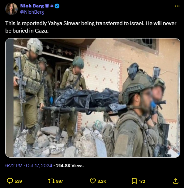 Il s'agirait de Yahya Sinwar transféré en Israël. Il ne sera jamais enterré à Gaza.