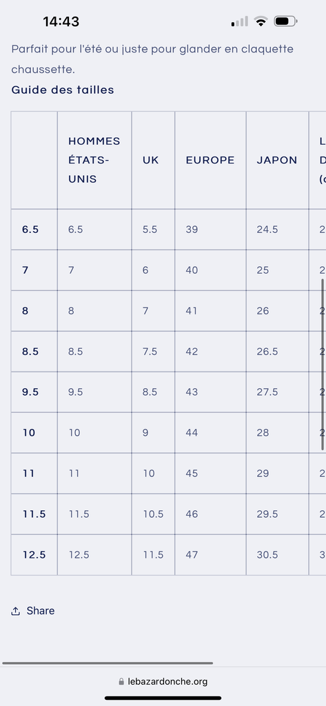 Par contre il n'y a pas la taille en européen, faut que tu me donne l'équivalent je fais du 43