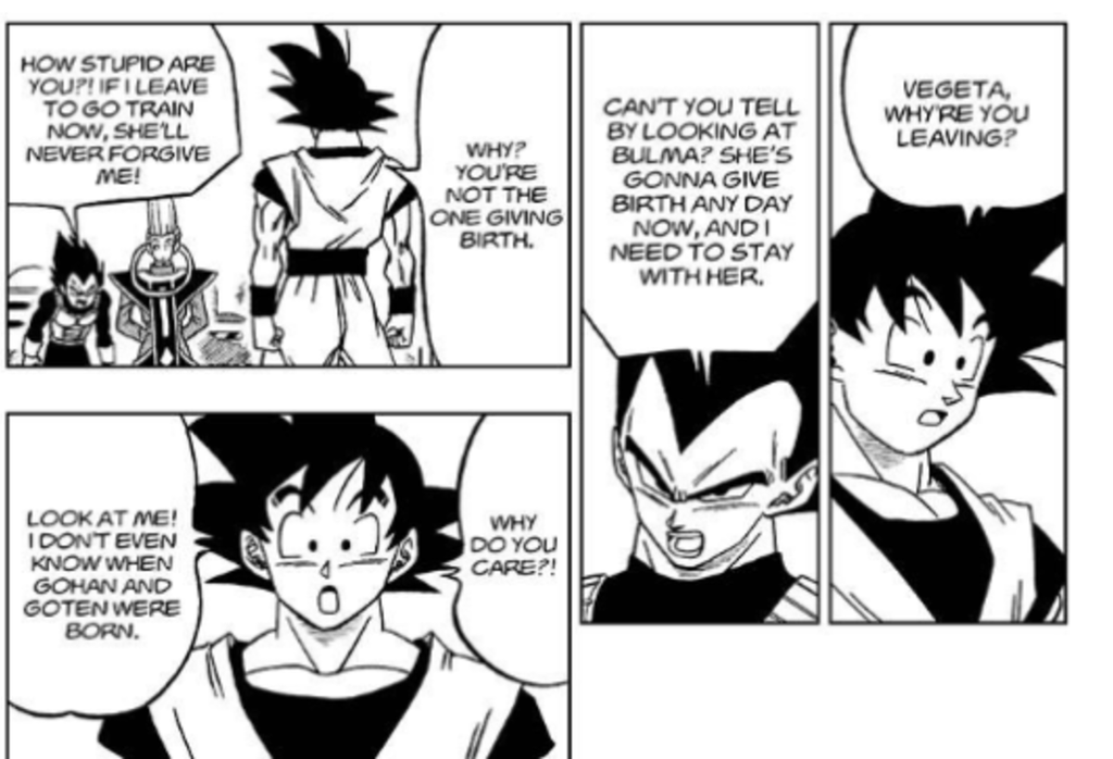 Vegeta qui veut rester au près de sa femme qui veut accoucher. Goku lui dit "Abandonne la comme j'ai abandonné la mienne"