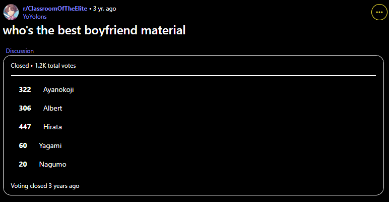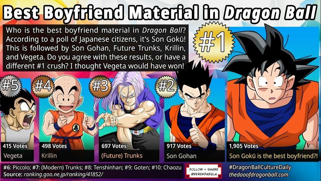Après, le Goku est protagoniste comme un Luffy dans la popularité, on le voit bien plus que Krillin donc on peut se dire que c'est pas étonnant qu'il soit en numéro un, ça crée une affinité plus grande par habitude, les classements de ce que préfèrent les femmes, il faudrait faire pour plusieurs mangas réunis qu'un seul manga où on va trouver souvent le protagoniste, bien que ce soit justifié.