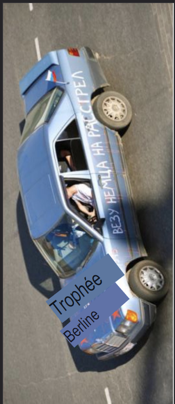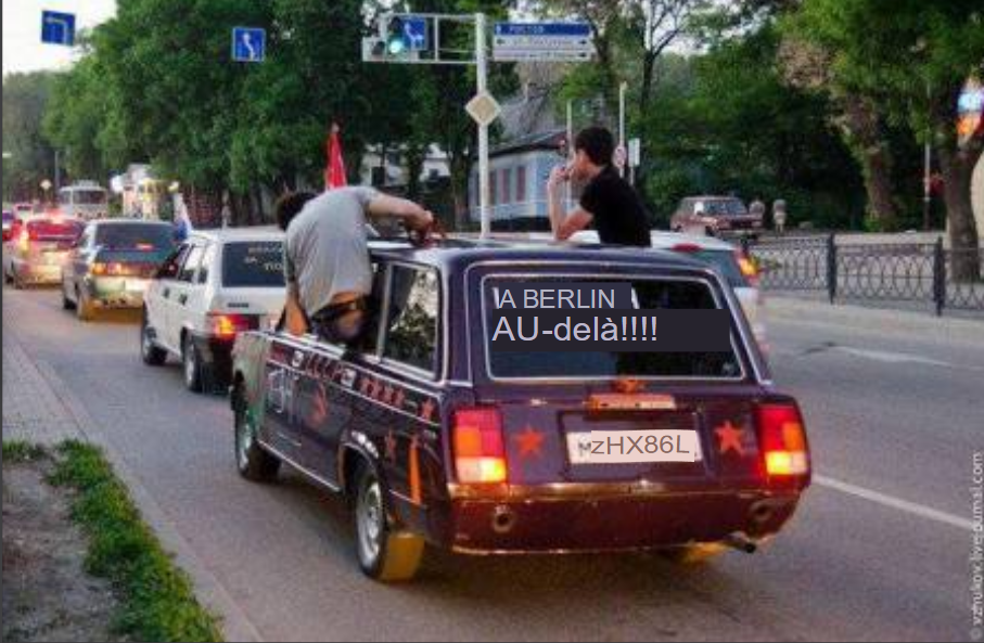 Le premier message semble vouloir dire "A Berlin et au delà" ce qui traduit une volonté de conquête basé sur une référence à la 2e GM.