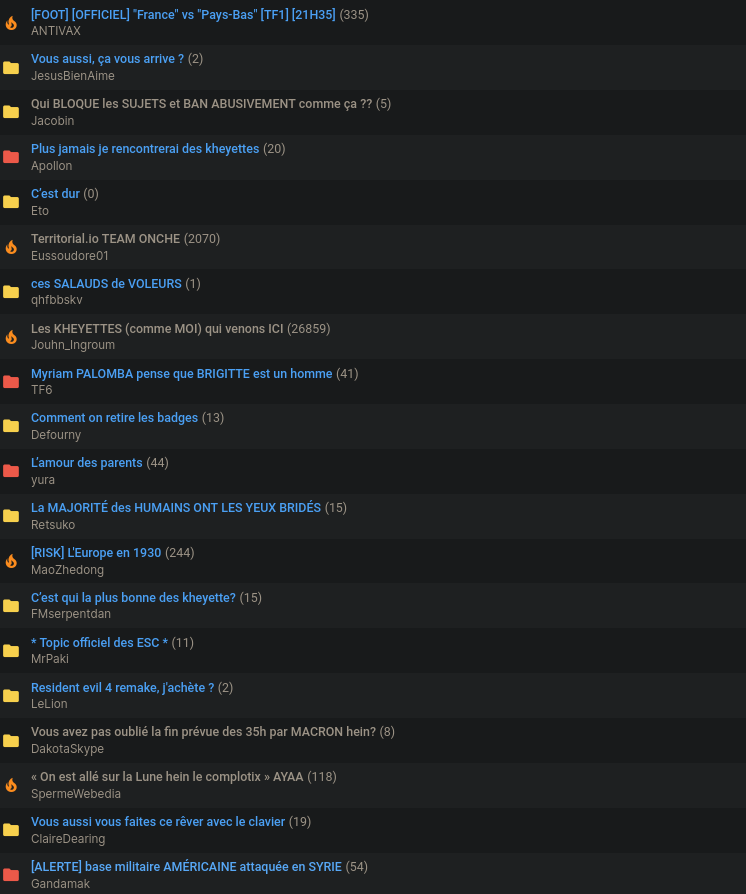 Le sujet sur le Foot, le territorial, celui sur l'amour des parents, le risk, celui des ESC, celui sur Lune et la base militaire attaquée. Soit 7 topics intéressants en page 1 : c'est déjà pas mal.