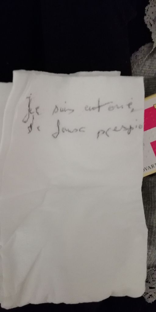 ensuite elle a écrit sur un mouchoir et me l'a mis dans la poche, je l'ai lu en rentrant et j'ai eu froid dans le dos Image