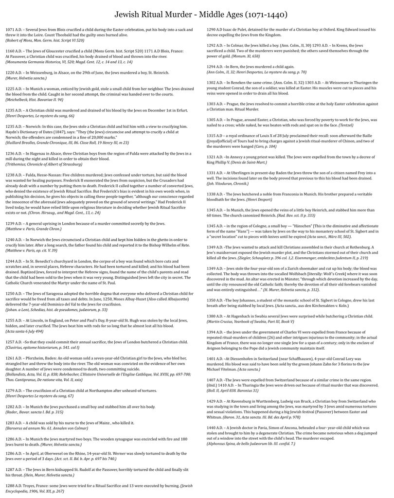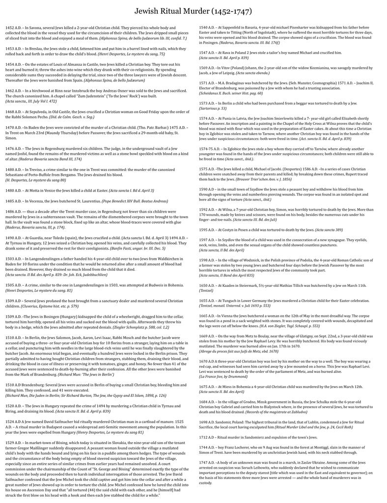Ces cinq incidents sont parmi les plus connus. Comme la liste est énorme, il y a tous les meurtres rituels juifs du Moyen-Âge que j'ai pu trouver dans cette image.