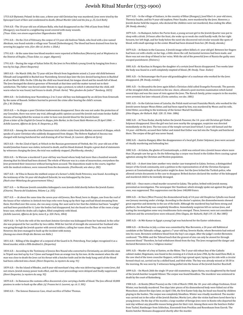 Il existe de nombreux incidents similaires à celui-ci datant des années 1800, comme la célèbre affaire de Damas, le « crime rituel de Rhodes » et bien d'autres encore. Dans l'image ci-dessous, j'ai rassemblé quelques meurtres rituels des années 1753-1900.