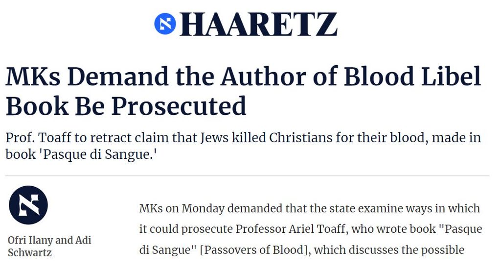 Un autre livre très instructif est "Pâques de sang" de l'historien juif Ariel Toaff. Le livre a provoqué une réaction violente et les députés ont exigé que l'État examine les moyens par lesquels il pourrait poursuivre le professeur Ariel Toaff.