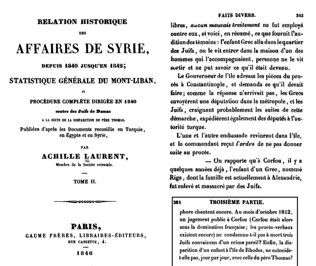 - 1812 ap. J.-C. – sur l’île de Corfou en octobre, trois juifs qui avaient étranglé un enfant furent condamnés à mort. Quelque temps plus tard, l’enfant d’un grec, appelé Riga, fut volé et tué par les juifs.