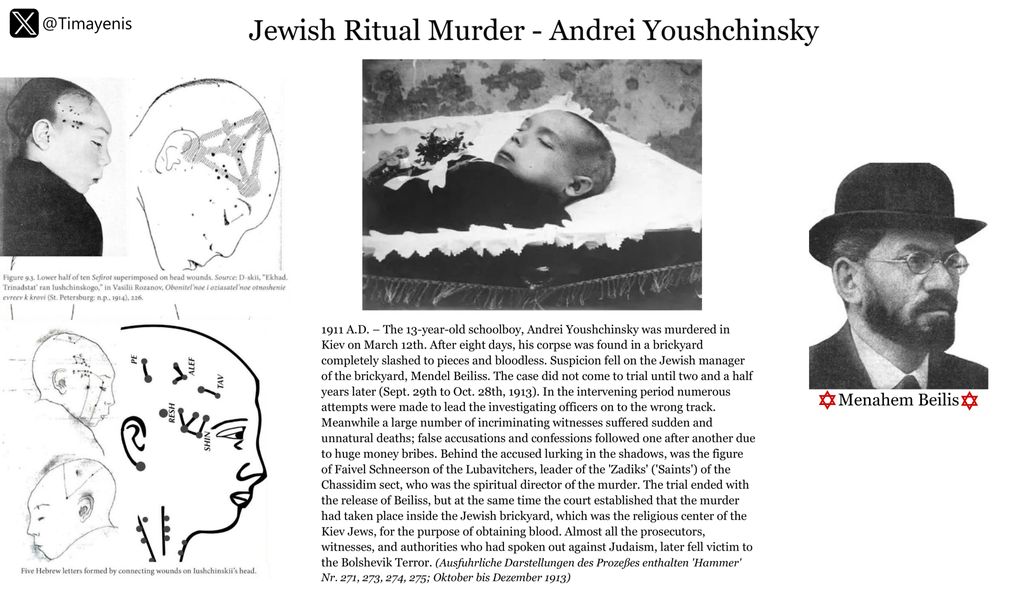 - 1911 après J.C. – L'écolier de 13 ans, Andrei Youshchinsky, est assassiné à Kiev le 12 mars par Menahem Mendel Beilis.