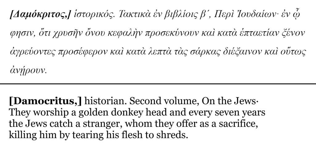 L'auteur gréco-égyptien Apion affirmait que chaque année les Juifs sacrifiaient un Grec dans leur temple et que, lors du rituel, ils juraient une haine éternelle envers les Grecs. Des affirmations similaires furent formulées par Posidonius et Apollonius Molon au 1er siècle avant J.-C.