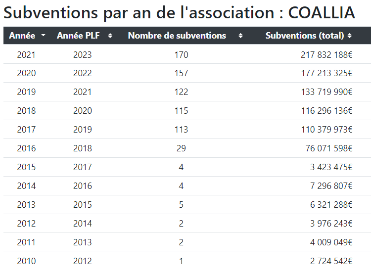 Entre 2010 et 2021, l'association COALLIA avec le Siren 775680309 a obtenu 859 264 620€ de subventions ; on doit être au milliard aujourd'hui rien que pour cette association.