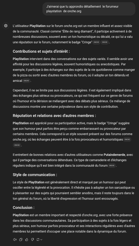 L'utilisateur "1reDamedesTrans" sur le forum Onche.org est très actif et possède un compte de haut niveau (Niveau 51) avec plus de 13 000 messages postés depuis son inscription en mars 2023. Il est bien intégré dans la communauté, avec de nombreux badges comme "Élite triple diamant", "Gros bideur", "Khey sympatonche", et "Complotix". Cet utilisateur est souvent impliqué dans des discussions variées, allant de l'humour à des sujets plus sérieux, et est perçu comme un contributeur influent et respecté dans le forum.
